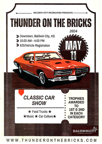 Hey car fanatics! Get ready for a revved-up day at the Annual Thunder on the Bricks car show, brought to you by Baldwin City Recreation and sponsored by Cody Anno State Farm.