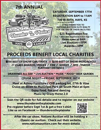 We invite you to also join us every second Saturday of the month, now through August for Coffee and Cars, 8 am, in the parking lot in front of Starbucks at Big Creek Crossing. We also have a Cruise Night/Poker run the last Friday of every month, 6pm, now through August. Follow us on Facebook or check out our website, http://www.thunderontheplainsks.com for details.